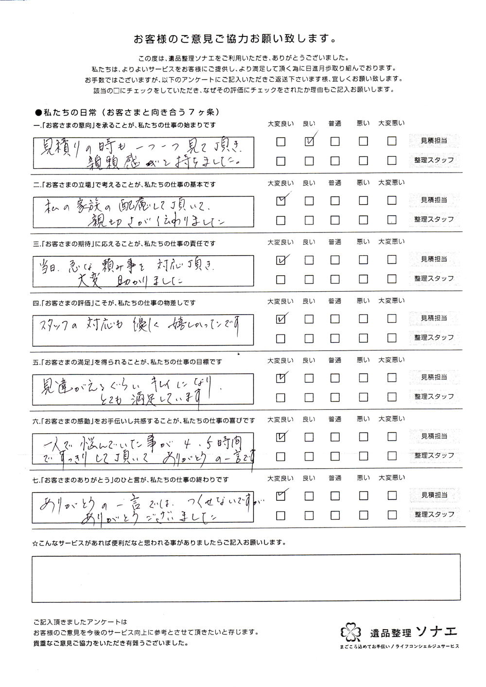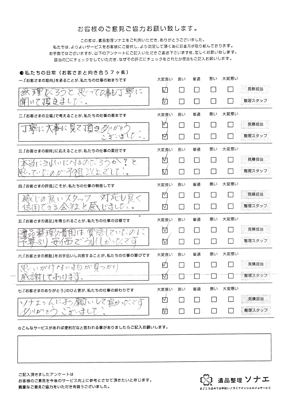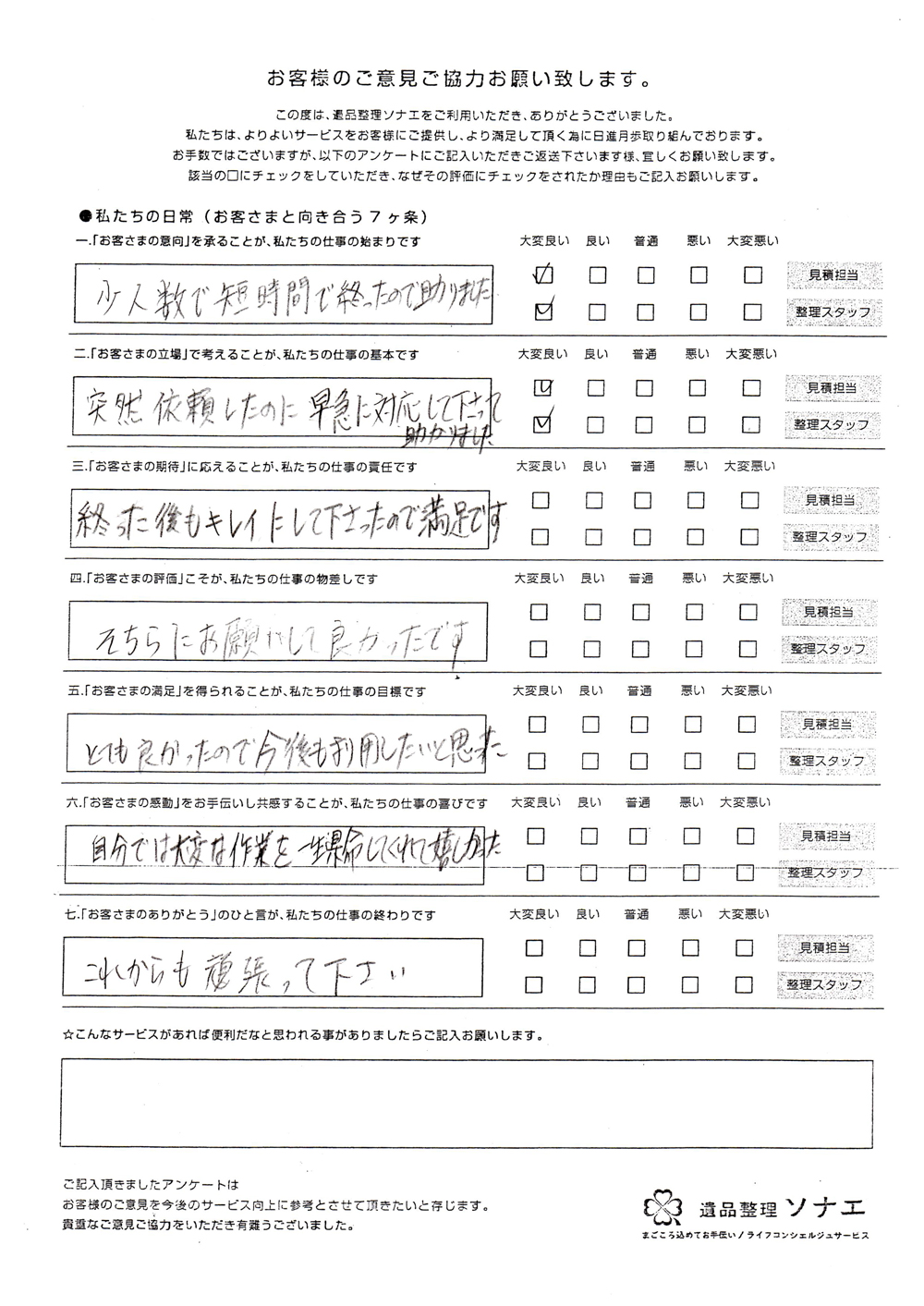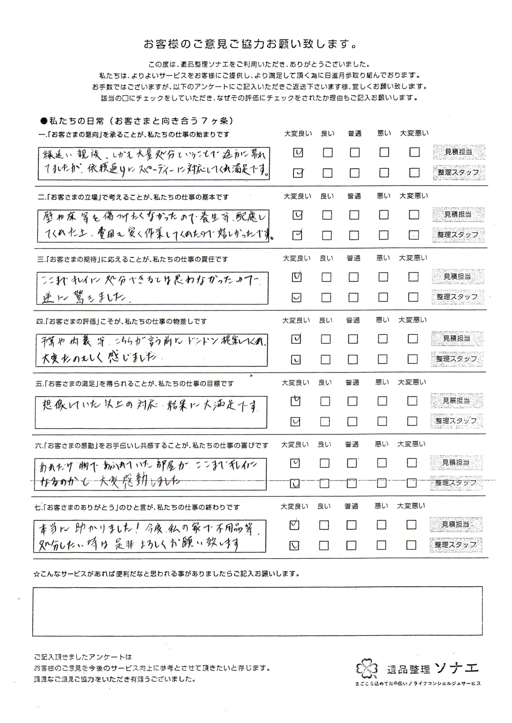 遺品整理ソナエでは迅速・丁寧・真心をモットーに年間施工件数500 件を超える遺品整理等 数多くのノウハウと経験があります。