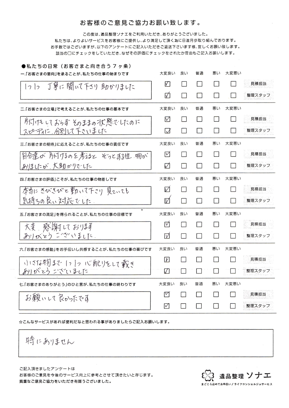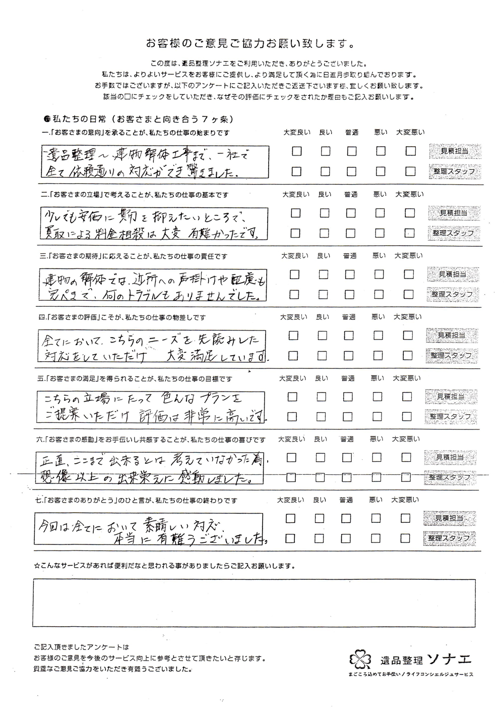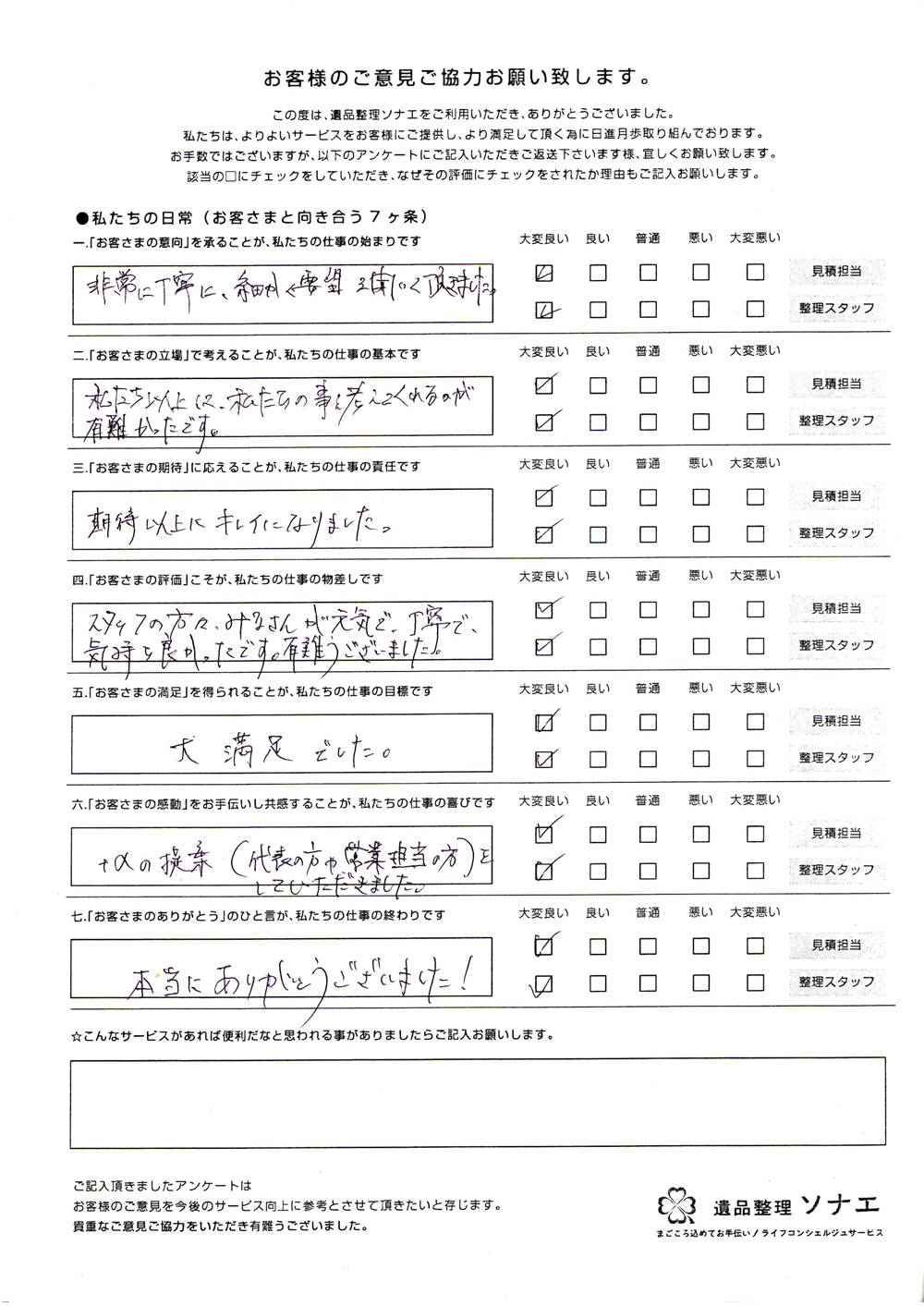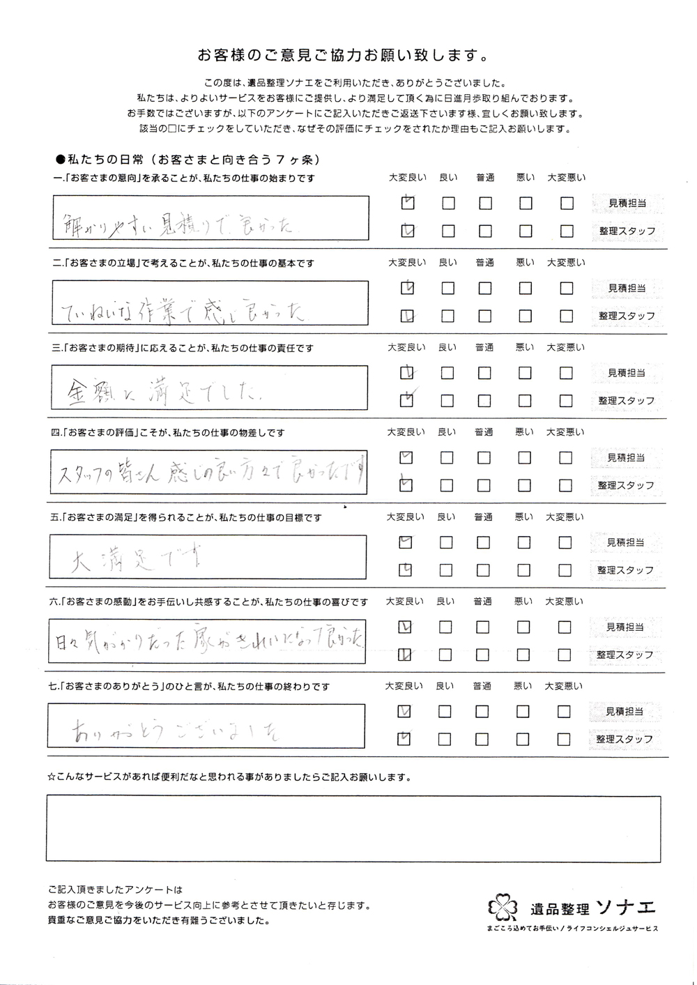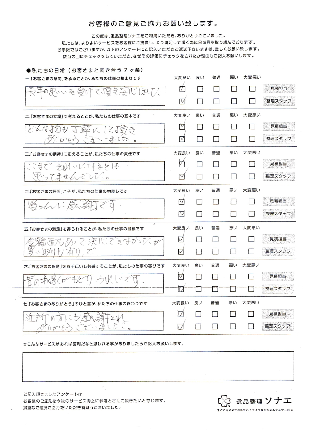 遺品整理ソナエでは迅速・丁寧・真心をモットーに年間施工件数500 件を超える遺品整理等 数多くのノウハウと経験があります。